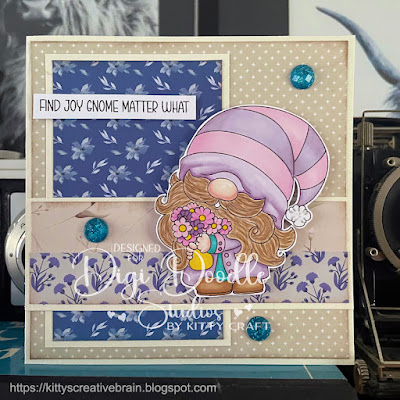I got to play with this cute TPS image called "You Never Know" and coloured it with Promarkers and fussy cut it. The card I created is a small portrait card with the fold at the top. To create this card I used the following items; craft cardstock, double sided pattern cardstock (used both sides), walnut stain distress ink and I created a sentiment on transparant tape with my Dymo Letratag.